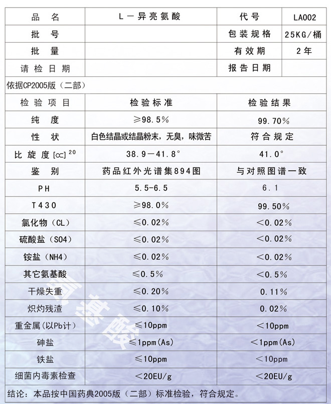 L-Isoleucine,CH3-CH2-CH(CH3)-CH(NH2)-COOH,α -氨基-β-甲基戊酸,又名:異白氨酸 ,分子式: C6H13NO2 ,分子量:131.17.